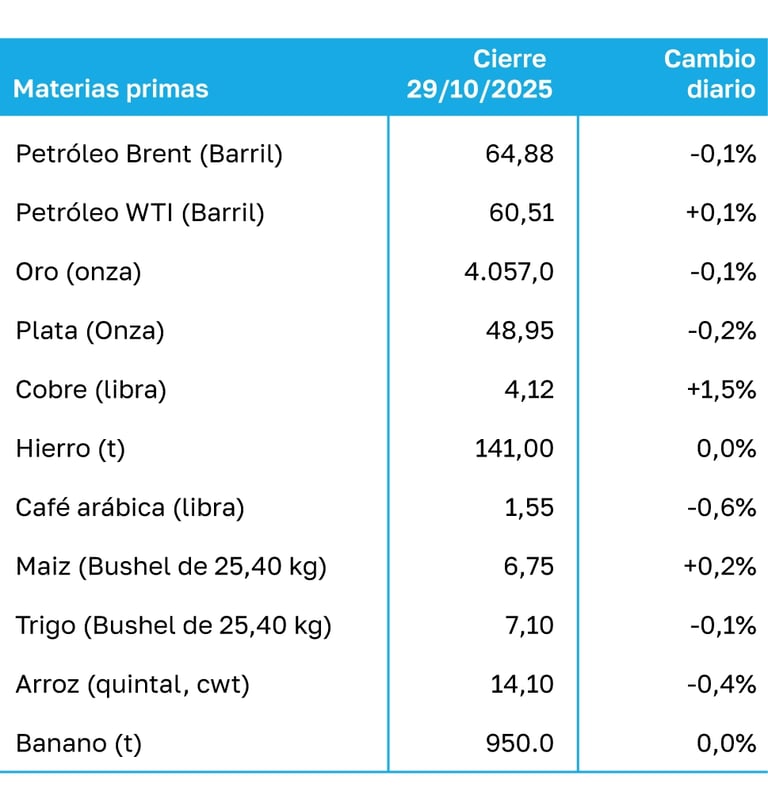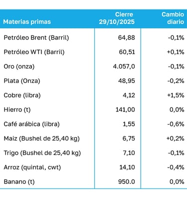 El petróleo se mantuvo estable en las dos variantes cotizadas (Brentt y WTI). Oro y plata mantuvieron su tendencia al alza, evidenciando que los inversionistas siguen buscando activos refugio en activos frente a la volatilidad global. En los alimentos, los movimientos fueron moderados, reflejando un equilibrio temporal a la espera de definiciones.